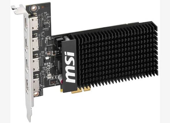 MSI nVidia Geforce GT 710 2GD3H 2GB PCIe 2 x16 Graphics card PCI Express 2.0 x16 (Uses x8) Interface, 954MHz Core clocks, 1600MHz Memory Speed, GDDR3 Memory Type, 64-bit Memory Bus, 4 Maximum displays, 4 HDMI connectors, 4096x2160 @ 24 Hz Max Resolution.